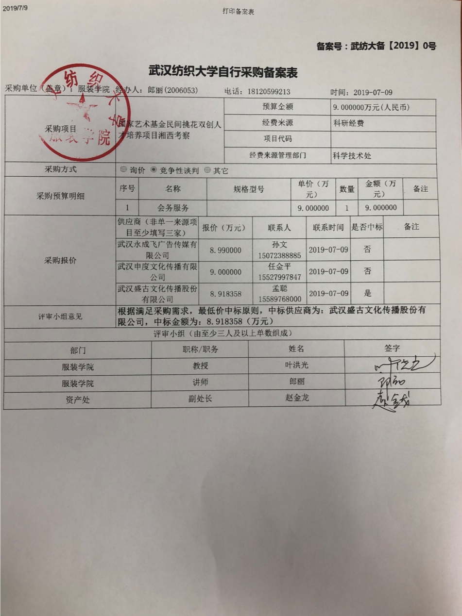 兹由于工作需要,雷火电子竞技平台自行采购国家艺术基金民间挑花双创人才培养项目湘西考察会务服务项目,特此公示。公示期为2019年7月11日—2019年7月18日。