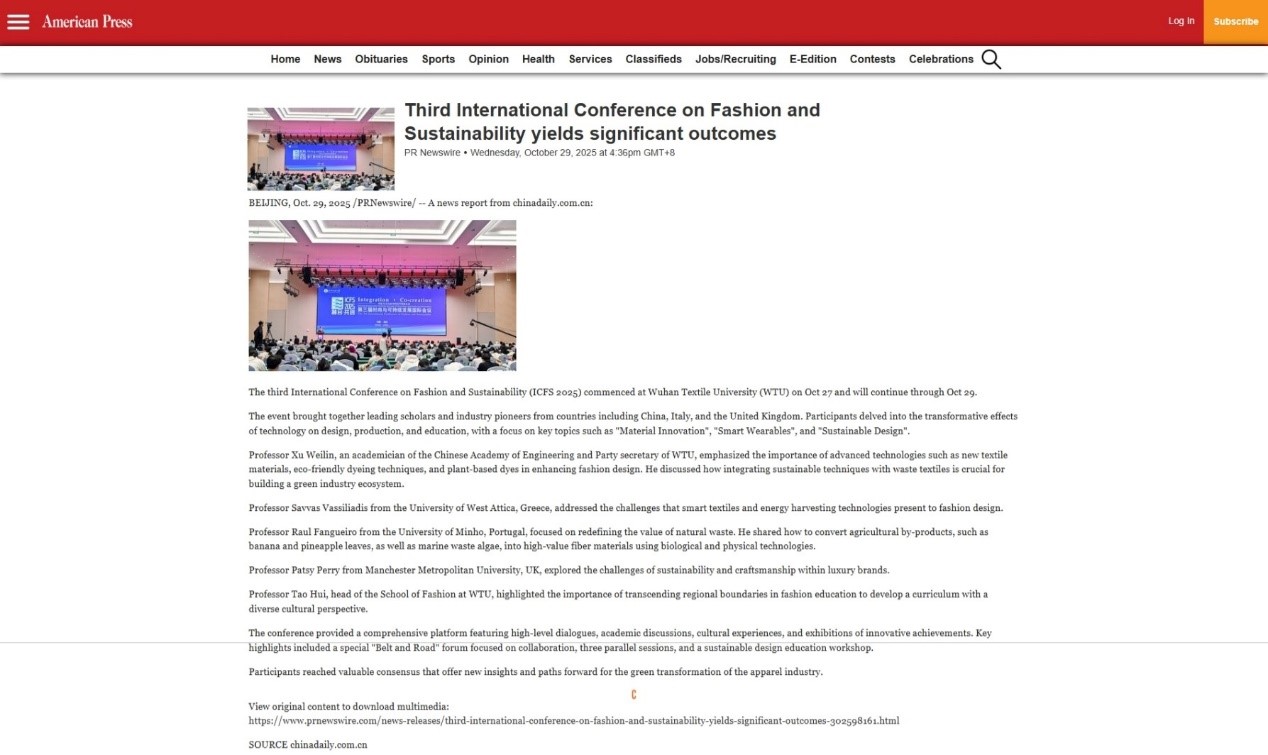 10月27日,以“融合·共创:科技与文化助力时尚可持续发展”为主题的第三届国际时尚与可持续发展会议在雷火·竞技官网盛大开幕,中国日报网于10月29日刊发英文稿件Third International Conference on Fashion and Sustainability yields significant outcomes。截至目前,已有654家海外媒体网站进行转载,覆盖全球受众超过1.6亿人次,知名媒体包括美联社、美通社、雅虎财经、美国广播公司、美国福克斯广播公司、美国(全国)广播公司等进行转载,取得了良好的传播效果。