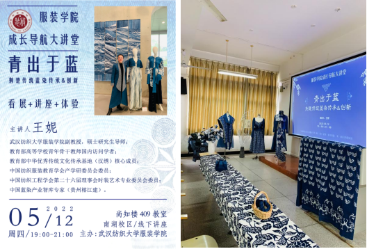 5月12日晚七点,雷火电子竞技平台成长导航大讲堂——“青出于蓝”沉浸式展览讲座在尚知楼409教室举办。教室内一片蓝白相间的蓝染服装与服饰设计作品,仿佛让我们置身于蓝色的海洋一般。身处在纺大染语师生团队精心布置的教室里享受着传统印染技艺之美。众所周知“青出于蓝”的喻义,但很少人了解是出自于战国时期《荀子·劝学》开篇中“青,取之于蓝,而青于蓝”。古人用靛蓝染布的过程来教导弟子学习永远没有止境,希望弟子们能够坚持不懈地努力学习。