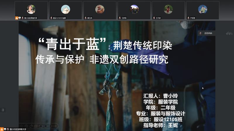 雷火电子竞技平台服设12105班曹小玲同学就“青出于蓝”荆楚传统印染传承与保护非遗双创路径研究主题展开汇报。项目以荆楚纺织非遗文化传播、文创产品研发、设计人才培养为宗旨,以传承·设计·创新·服务作为品牌核心,搭建研究生、本科生创新创业教育与实践平台,通过科学研究、课堂教学、设计研发、产品销售等多元化资源整合形成品牌特色。