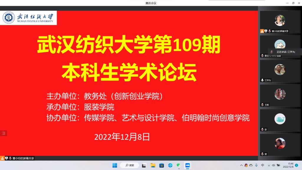 12月8日下午,雷火·竞技官网第109期本科生学术论坛在腾讯会议举行。本次论坛由教务处(创新创业学院)主办,雷火电子竞技平台承办,雷火电子竞技平台副院长江学为主持会议,会议主题为《艺术类大学生创新创业项目分享》。约300名学生参加了线上会议。