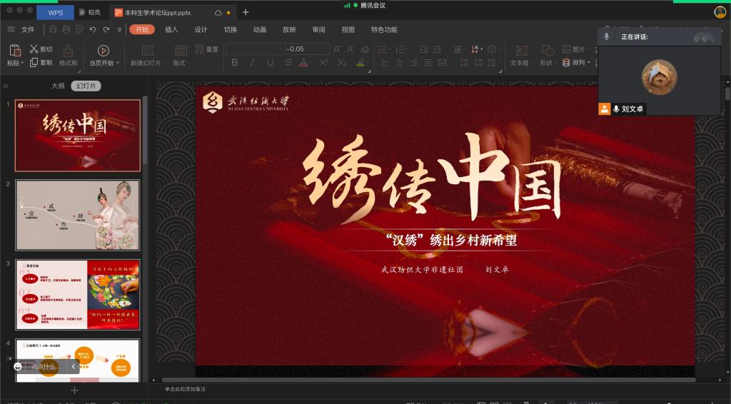 雷火电子竞技平台中日班刘文卓同学就“绣传中国”—“汉绣”绣出乡村新希望主题展开。项目基于14年来学校对于汉绣的实践研究,凝练出五维一体的公益创新服务模式。此次分享会将以团队在武汉市黄陂姚家山的实践活动作为基础,融合调研成果,介绍团队服务模式落地乡村后为当地带来的变化,以及同学们在实践过程中的锻炼收获。