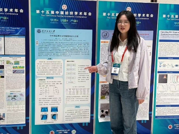 胡心月同学以《华中地区青年女性腰臀部特征及分类》为题在论坛的海报展示环节中吸引了众多与会者交流。该研究通过系统的人体测量学分析,引入人体体表曲率为分类指标,精准刻画了特定地域人群的体型特征,其研究成果对于服装的合体性设计、个性化定制及号型标准的优化具有重要的应用价值。