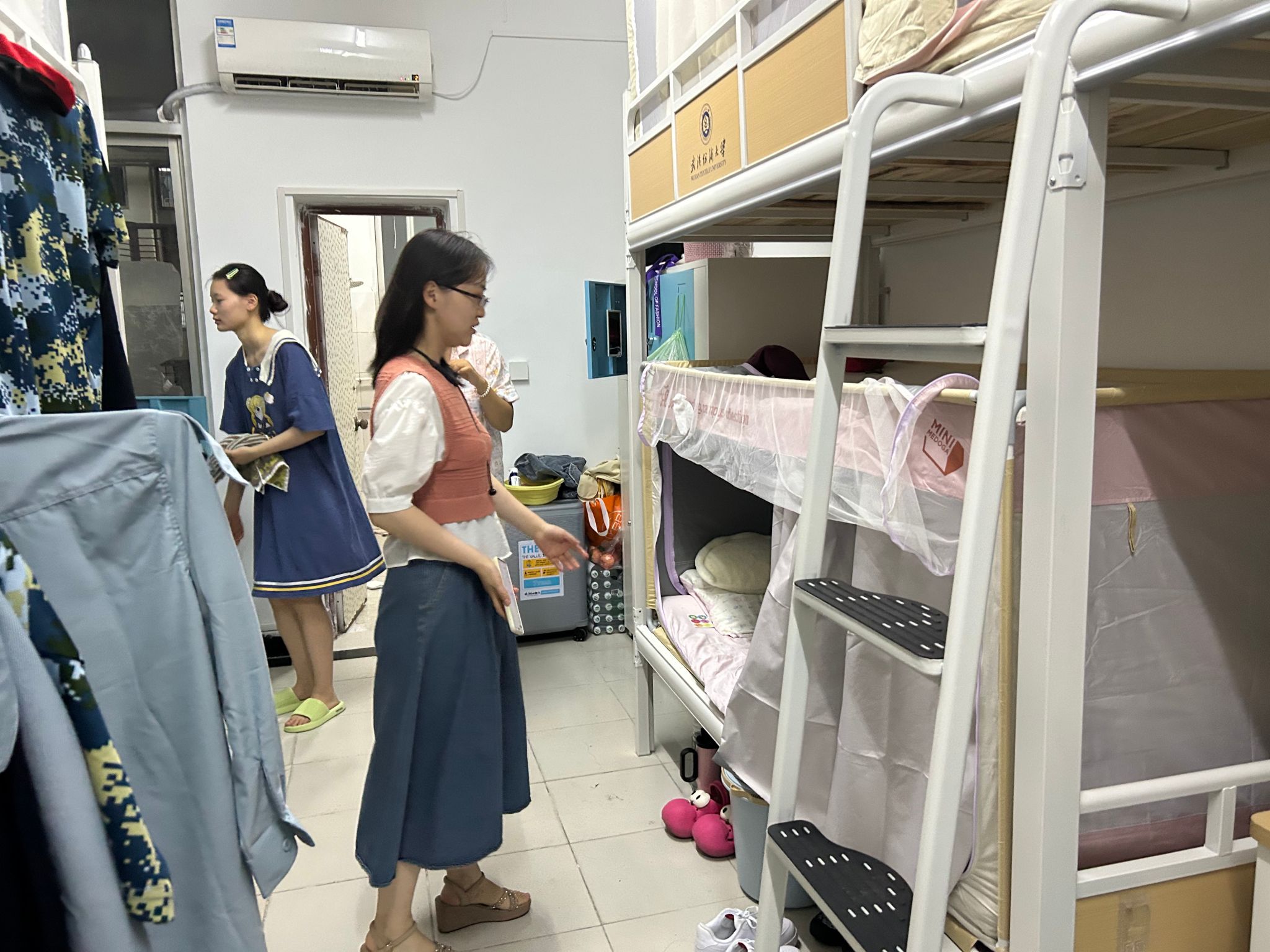 在检查过程中,各年级表现良好,积极配合。本科和研究生25级、24级宿舍表现尤为突出,多数宿舍地面干净无杂物,被褥叠放整齐,生活用品摆放井然有序,部分宿舍还通过绿植、励志标语、手工作品等装饰营造出温馨奋进的文化氛围,涌现出多个优秀寝室,获得检查小组一致认可。高年级宿舍亦可圈可点,整体卫生与秩序保持良好,文化氛围浓厚。但也发现少量宿舍存在问题,个别寝室烟头散落、违规饲养宠物、垃圾乱扔等现象,检查人员已当场明确整改要求与时限,后续将由辅导员跟进整改落实。