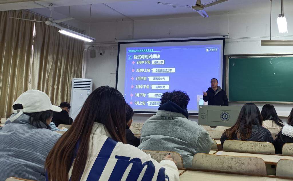 为帮助考研同学深入了解考研复试准备和调剂相关政策,2月23日上午10点在南湖校区综合楼5409,雷火电子竞技平台举办考研复试调剂指导答疑课。本次答疑课邀请万学教育海文考研湖北分校校长谭晓禹老师主讲,本次答疑课还同步进行了线上直播。