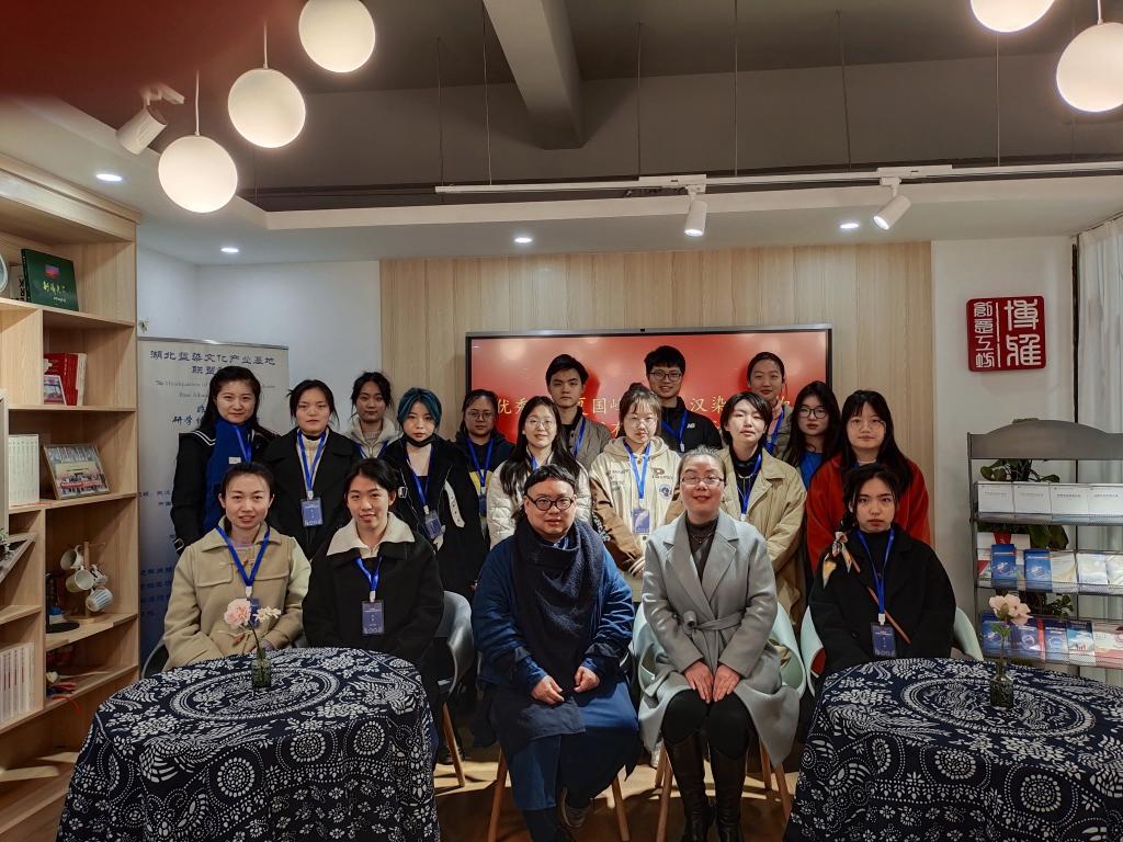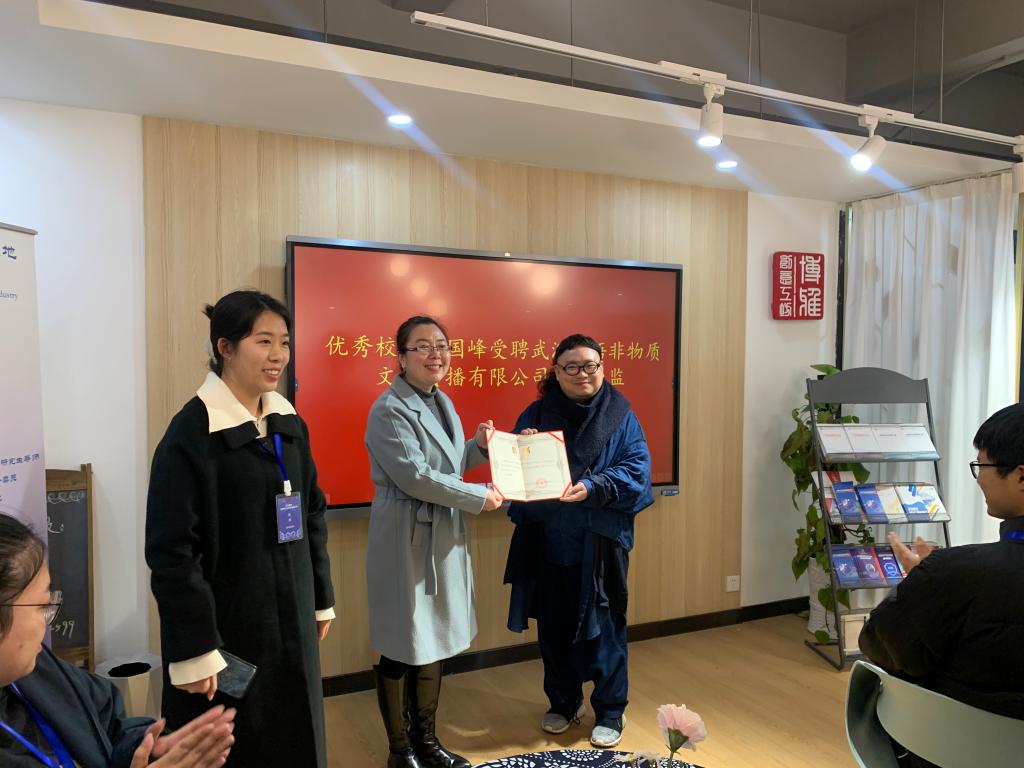 2月25日下午,在华中师范大学国家大学科技园湖北蓝染文化产业基地联盟总部——非遗印染研学体验工坊,举办了一场“与设计师面对面”的交流活动。雷火电子竞技平台优秀校友夏国峰受聘担任武汉染语非物质文化传播有限公司设计总监一职,公司董事长、雷火电子竞技平台研究生罗家萍主持,团队导师王妮副教授为其颁发聘书,公司二十多名成员参加。