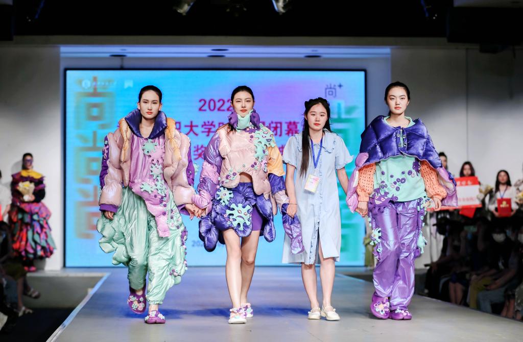 此次的闭幕大秀,是在全院2022届毕业生作品中优选32个系列共82套作品,作品延续服装学院的教学优势与特色,立足创意成衣,在“尚+”设计主题和可持续理念下,从风格、造型、面料、色彩、情感、科技、生活方式等多个维度出发,融合时尚与可持续,展现服装学子的创意思维和独特个性,诠释设计师们对可持续设计理念的理解。